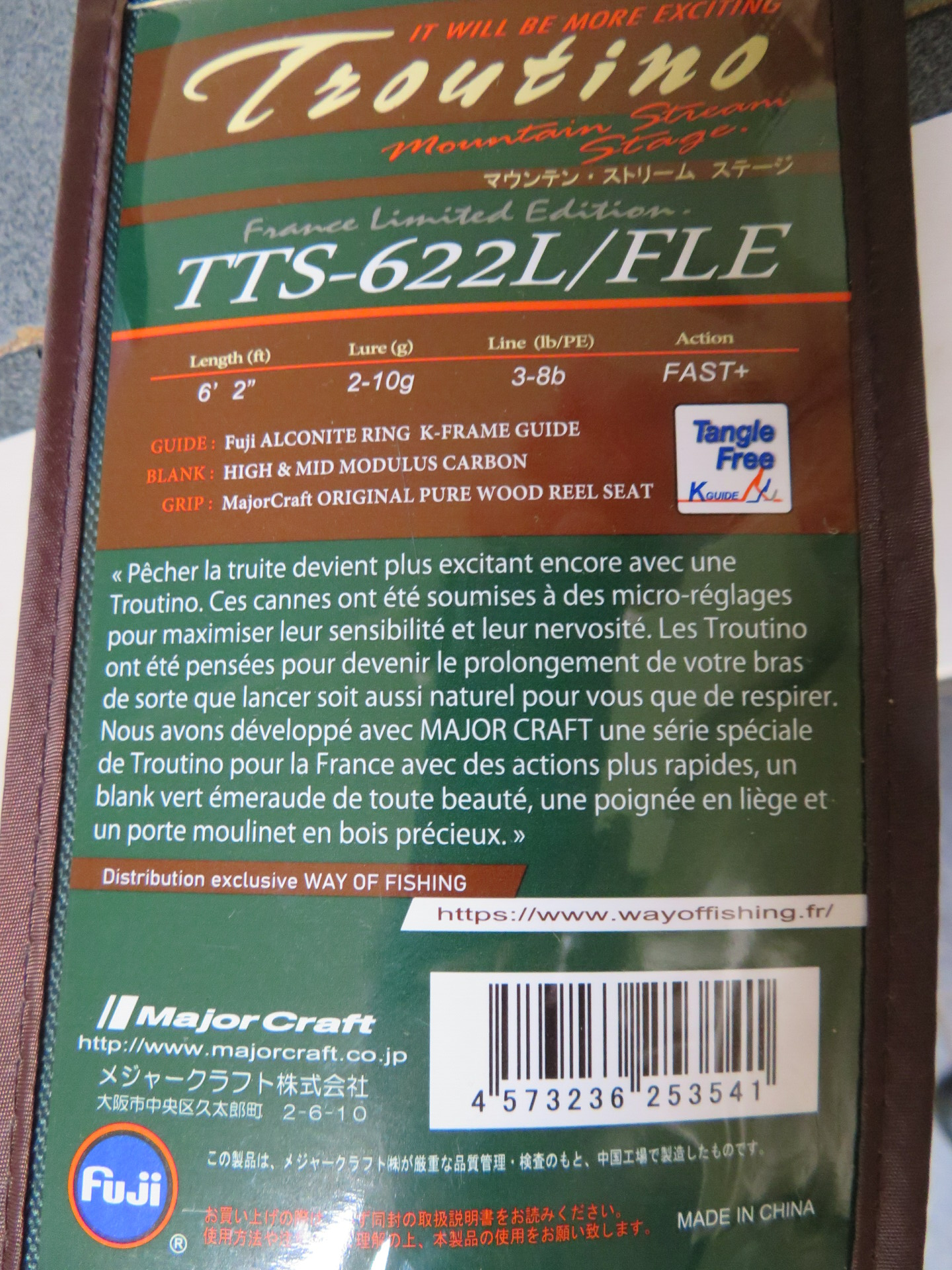 Major Craft is een Japanse (of wat dacht je?)fabrikant van hoogwaardig hengelsportmateriaal waaronder prachtige hengels en om te beginnen heb ik er ééntje gekozen uit de "France Limited Edition".Dit zijn hengeltjes die Franse topvissers door Major Craft hebben laten bouwen.Eigenlijk zijn het originele Major Craft hengels waar een paar kleine veranderingen zijn aangebracht geheel volgens deze topvissers hun wensen.Het gaat hier om een beperkte editie met een prachtige emerald-groene kleur van blank afgewerkt met molenhouder van zeer mooi en superglad hardhout en met handvat van hoogwaardige zachte kurk!De actie is snel tot zeer snel en hij werpt dan ook als een speer.Met de zeer gevoelige blank voelt men werkelijk het kleinste tikje en de actie van je aasje.Voor de gevorderde visser die meer uit zijn visserij wil halen is dit juweeltje een echte aanrader!Je kan deze overigens ook natuurlijk even bekijken en testen,ik heb er eentje opgetuigd!